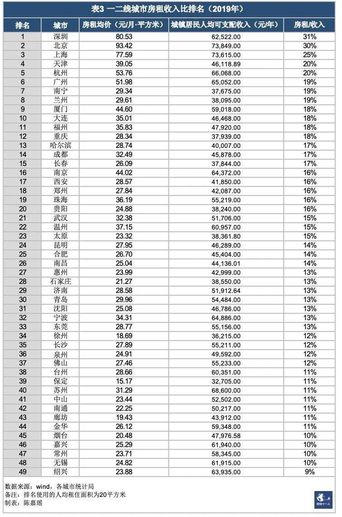 《财经》记者统计了2019年至今主要一二线城市房租占收入的比例,结果显示: