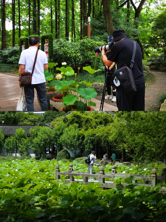 盛放的荷花与醉白池的亭台楼榭相得益彰,吸引了众多文人墨客、摄影爱好者前来观光揽胜,他们纷纷带上“长枪短炮”,沉醉在古韵悠扬的情境之中。