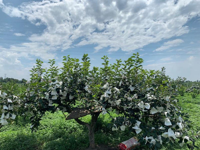 在野龙果业的种植基地里,20亩苹果园显得并不起眼,苹果树本身也无甚稀奇,无论是树高、树冠形状都和普通梨树差不多。不过,当谢金祥摘掉苹果树上的深灰色套袋、露出里面的果子时,记者顿时眼睛一亮:终于见到“活的”苹果了!