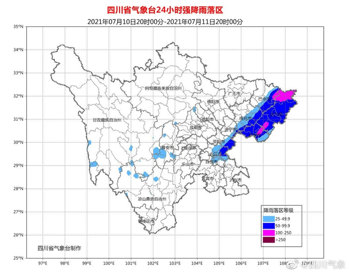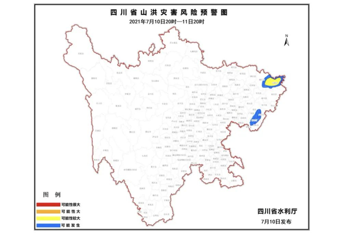 7月10日17时,四川省水利厅发布山洪灾害蓝色预警,7月10日20时至7月11 日20时,通江、万源等县 (市、区)发生山洪灾害可能性较大(黄色);平昌、大竹、 渠县、华蓥、邻水、前锋等县(市、区)可能发生山洪灾害(蓝色)。