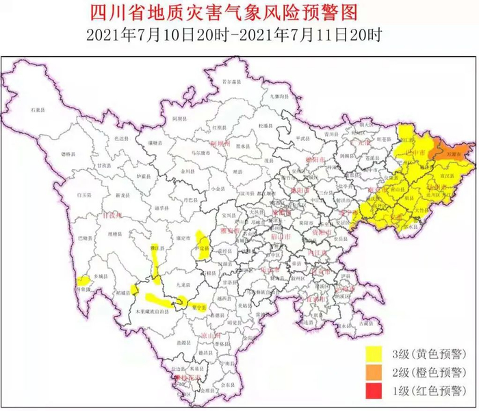 7月10日,四川省地质灾害指挥部办公室结合四川省气象台天气预报情况,分别发布地灾气象风险橙色、黄色预警。
