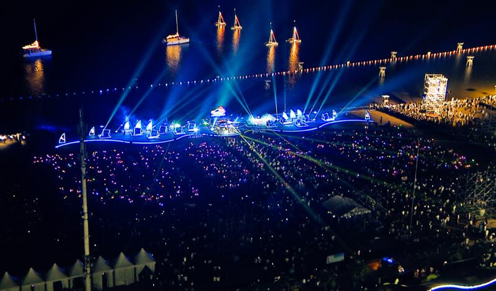 7月10日晚的滨海嘉年华开幕式,让人耳目一新。在海边沙滩上,近十架钢琴一字排开,专业钢琴师同时弹奏;在近海区域,帆船勾勒出了绚丽的灯光秀;在远处海面上,烟花瞬间燃放,映满整个海面。钢琴和DJ同奏,烟花与光影交融,场景美轮美奂。不少游客看完大呼精彩,“长这么大第一次看到如此美丽的画面”。