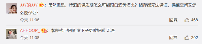 也有网友对此提出质疑,称“啤酒的保质期怎么可能跟白酒黄酒比?储存都无法保证,保值空间又怎么能保证?”