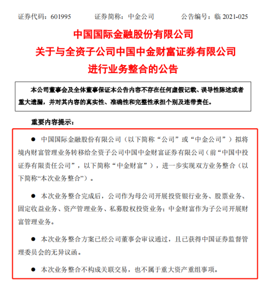2017年4月,公司完成收购中金财富100%股权。中金公司称,公司自完成收购后,积极推进与中金财富的业务整合与协同工作。为加快实现公司财富管理转型升级,公司拟与中金财富在已有整合工作基础上,通过将公司境内财富管理业务转移给中金财富,进一步实现双方业务整合。