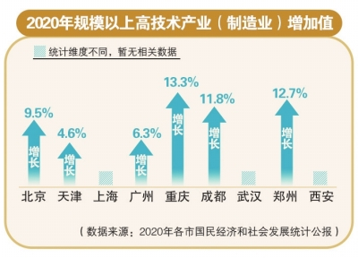 从增幅来看,在九大国家中心城市中,重庆的规模以上高技术产业(制造业)增加值同比增长13.3%,排名第一;郑州增长12.7%,稳坐亚军宝座;成都增长11.8%,排名第三;而天津的增速较为靠后。