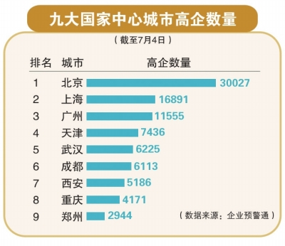 根据企业预警通平台的数据盘点,截至2021年7月4日,在九大国家中心城市中,北京、上海、广州的高新技术企业数量位列前三,分别为30027家、16891家、11555家。郑州拥有高新技术企业的数量仅为2944家,排名垫底。相比处在中游的天津(7436家)、武汉(6225家),仍存在较大差距;距离排名倒数第二的重庆,也相差千家以上。