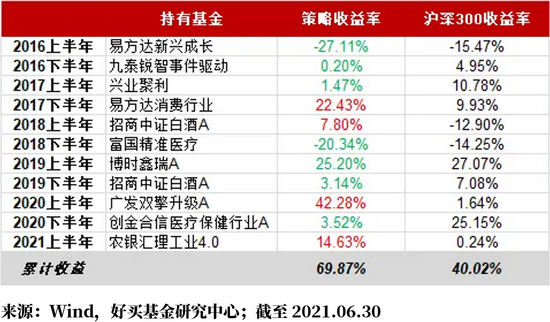 假如从2016年初开始用这个策略买入基金,一直到今年6月30日,刚好11个半年度,经过计算发现。整个下来,11个半年度中,只有4个半年度的回报是好于沪深300的:分别是,17年下半年和18年上半年分别靠易方达消费行业和招商中证白酒,20年上半年依靠广发双擎升级,21年上半年靠农银汇理工业4.0。