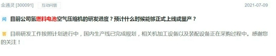 金通灵称,公司氢燃料电池空气压缩机研发工作按照计划进行中,国内生产线已完成规划,相关机加工设备以及装配设备正在采购过程中。
