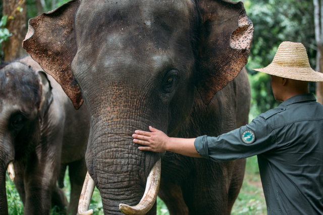 6月17日,云南西双版纳野象谷热带雨林,亚洲象种源繁育及救助中心的“象爸爸”抚摸亚洲象。