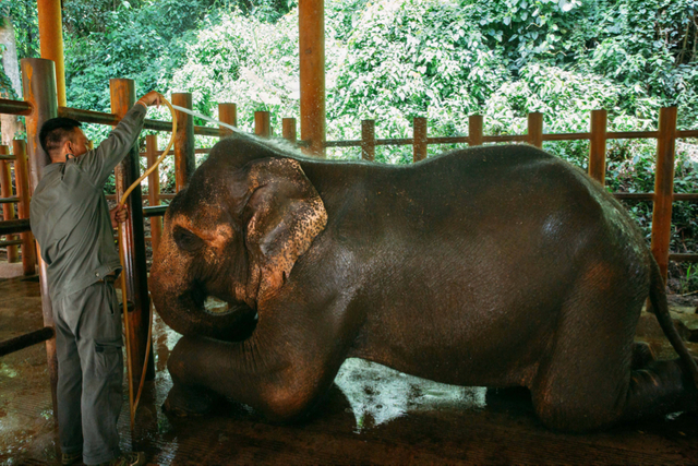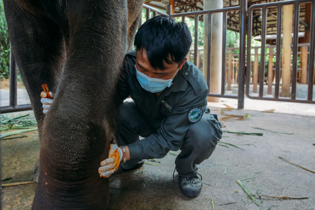 6月17日,中国云南亚洲象种源繁育及救助中心内,“象爸爸”在为一头脚受伤的亚洲象擦药。