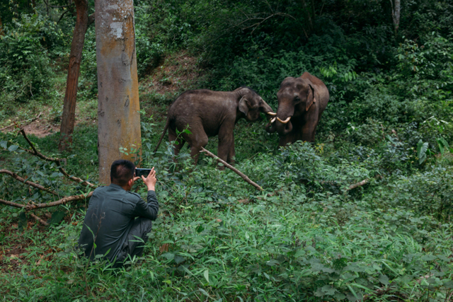 6月17日,云南西双版纳野象谷热带雨林,亚洲象种源繁育及救助中心的“象爸爸”记录亚洲象的活动。