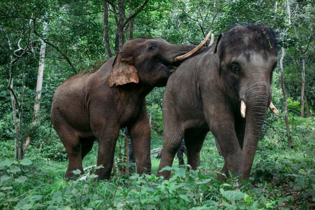 6月17日,云南西双版纳野象谷热带雨林,亚洲象小强(右)与阿宝(左)在林中玩耍。