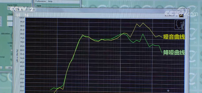 测试人员模拟了车站、机场等场所的噪音环境,输送100分贝的总噪音量,然后打开测试耳机的主动降噪开关,检验主动降噪效果。记者看到,降噪曲线图显示,测试耳机开启主动降噪功能后,低频段的声音曲线与100分贝的噪音曲线几乎重合,也就是说,这款耳机即使打开了降噪功能,耳机低频部分的声音仍然是100分贝。