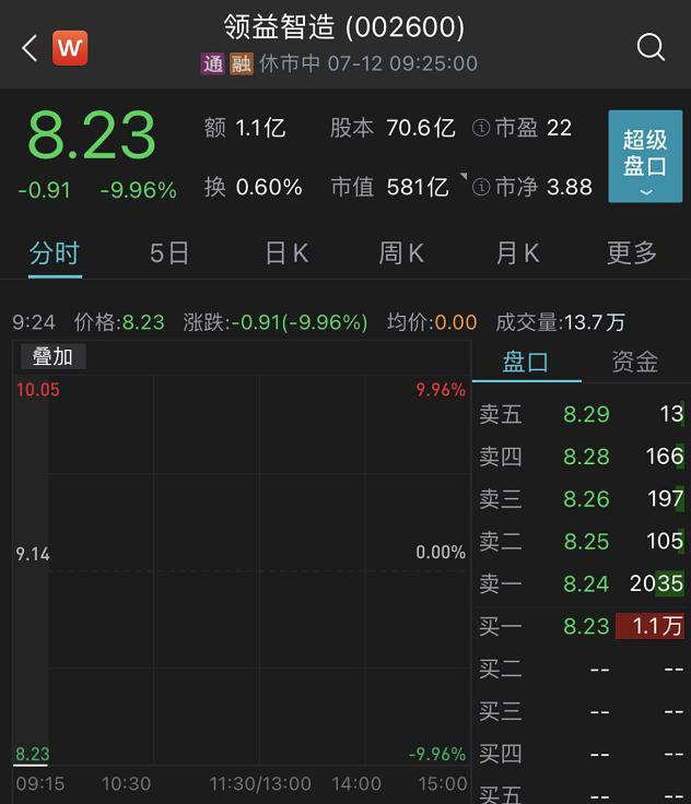 中新经纬客户端7月12日电 12日早间,三大股指高开,而苹果产业链龙头公司领益智造惨遭跌停,股价报8.23元/股,此前预告上半年业绩下降至多42.50%。