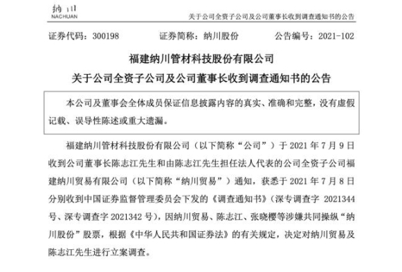 值得注意的是,纳川股份7月9日晚间公告称,公司获悉于7月8日分别收到中国证券监督管理委员会下发的《调查通知书》,因纳川贸易、陈志江、张晓樱等涉嫌共同操纵“纳川股份”股票,决定对纳川贸易及陈志江进行立案调查。纳川贸易为纳川股份全资子公司,陈志江为纳川股份董事长及纳川贸易法人代表。
