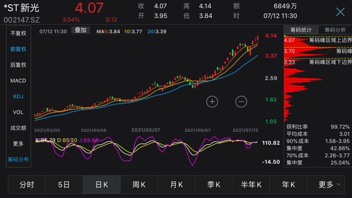 截至7月12日午间休盘,*ST新光报4.07元/股,总市值74.4亿元。