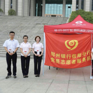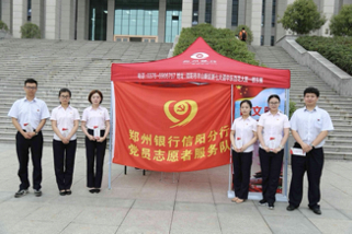 (图注:郑州银行信阳分行党员志愿服务队开展金融安全知识宣传)