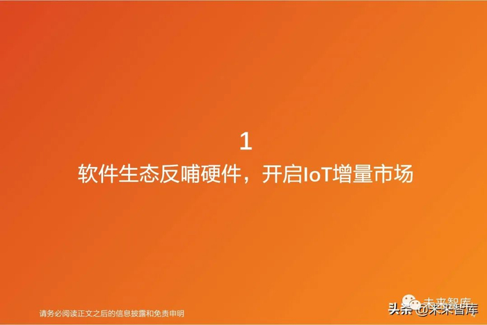 迎合物联网发展,开辟增量市场:华为若想获得操作系统的市场空 间,需要顺应产业变革方向,推出适合万物互联时代的操作系统, 争取增量市场空间。而鸿蒙OS正是致力于解决消费者多终端割裂体 验的问题,实现多个IoT设备的互联互通,迎合物联网发展方向。
