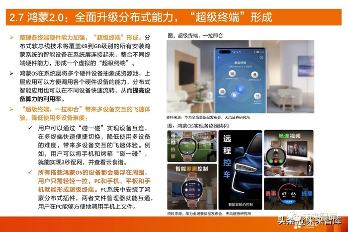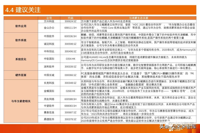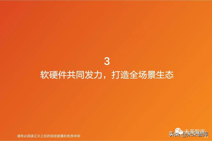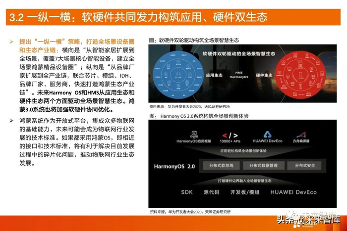 提出“一纵一横”策略,打造全场景设备圈 和生态产业链:横向是“从智能家居扩展到 全场景,覆盖7大场景核心智能设备,建立全 场景鸿蒙精品设备圈”;纵向是“从品牌厂 家扩展到全产业链,联合芯片、模组、IDH、 品牌厂家、服务商,快速打造鸿蒙生态产业 链”。未来Harmony OS和HMS从应用生态和 硬件生态两个方面驱动全场景智慧生态。鸿 蒙3.0系统也将加强软硬件协同优化。