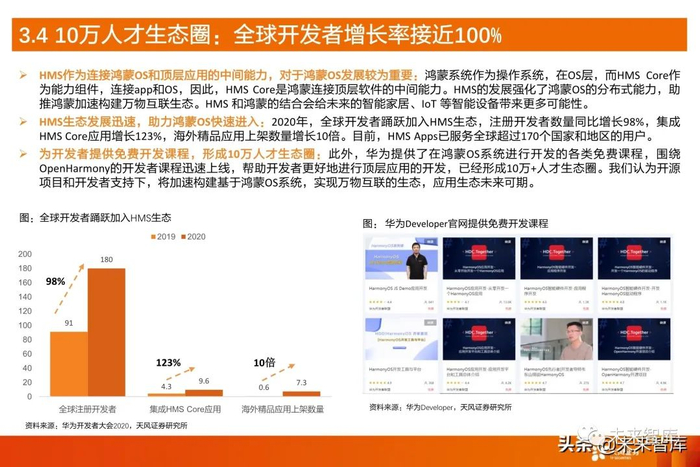 HMS生态发展迅速,助力鸿蒙OS快速进入:2020年,全球开发者踊跃加入HMS生态,注册开发者数量同比增长98%,集成 HMS Core应用增长123%,海外精品应用上架数量增长10倍。目前,HMS Apps已服务全球超过170个国家和地区的用户。