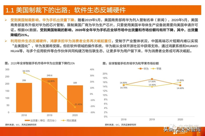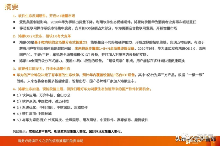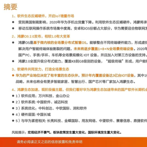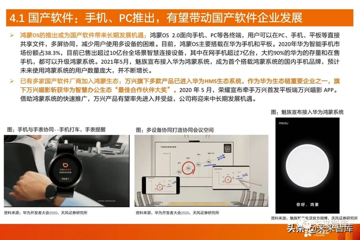 鸿蒙OS的推出或为国产软件带来长期发展机遇:鸿蒙OS 2.0面向手机、PC等各终端,用户可以在PC、手机、平板等直接 共享文件,多屏协同,减少用户使用多设备的困难。目前,鸿蒙OS主要搭载在华为手机和平板。2020年华为智能手机市 场份额占38.3%,目前已售出超过10亿台全场景智慧连接设备,其中在网手机超过7亿台,大约90%的华为的存量和在售 手机,都可以升级鸿蒙系统。2021年5月,魅族宣布接入华为鸿蒙系统,成为首个搭载鸿蒙系统的国内手机品牌,预计 未来使用鸿蒙系统的用户数量庞大,并不断增长。