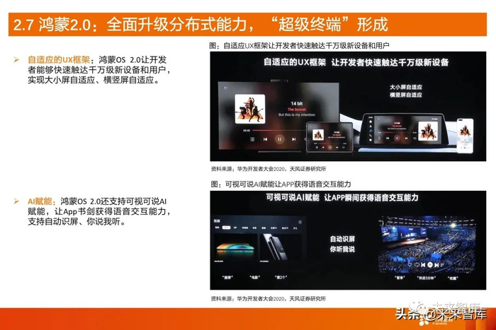 HarmonyOS Connect品牌升级将加速万物互联 生态的形成:截至2020年,HUAWEI HiLink已 有180万开发者,9.6万应用集成HMS,4.9亿 活跃用户数,2610亿应用累计分发量,已激 活5000万生态用户;智慧生活APP装机量达4 亿,全场景设备交互请求日均10.8亿次,成为 全球第三大移动应用生态。在构建全场景智 能硬件生态方面:已有800个硬件合作伙伴, 合作的智能产品超过3000款,智能硬件用户 超过5000万,累计发货量超过2.2亿。未来鸿 蒙 OS 将成为全场景智慧生态的底座 , HarmonyOS Connect的产品成为鸿蒙OS“超级 终端”的一部分,万物互联生态有望加速形 成。
