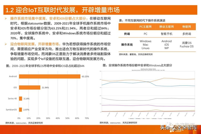 操作系统市场集中度高,安卓和IOS份额占大部分:在移动互联网 时代,根据statcounter数据,2009-2021年全球手机操作系统市场中 安卓和IOS市场份额分别为63.25%和21.94%,两者总和超过84%;2020年,全球操作系统中,安卓和Windows系统市场份额总和超过 70%,集中度高。