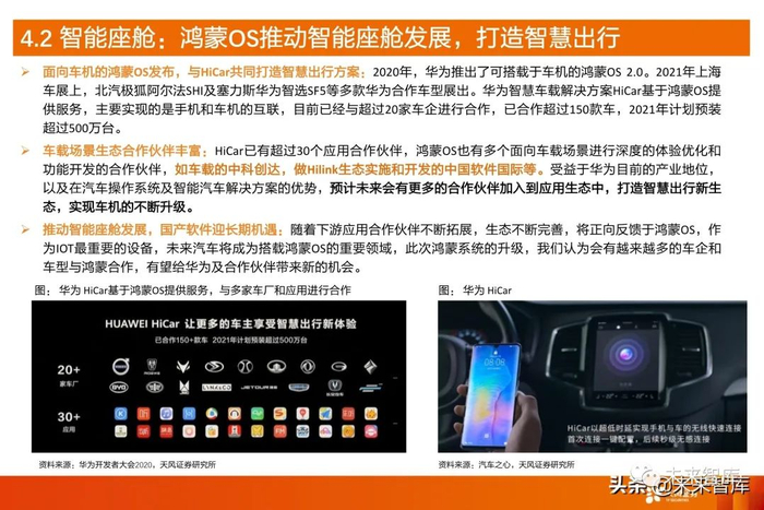 面向车机的鸿蒙OS发布,与HiCar共同打造智慧出行方案:2020年,华为推出了可搭载于车机的鸿蒙OS 2.0。2021年上海 车展上,北汽极狐阿尔法SHI及塞力斯华为智选SF5等多款华为合作车型展出。华为智慧车载解决方案HiCar基于鸿蒙OS提 供服务,主要实现的是手机和车机的互联,目前已经与超过20家车企进行合作,已合作超过150款车,2021年计划预装 超过500万台。
