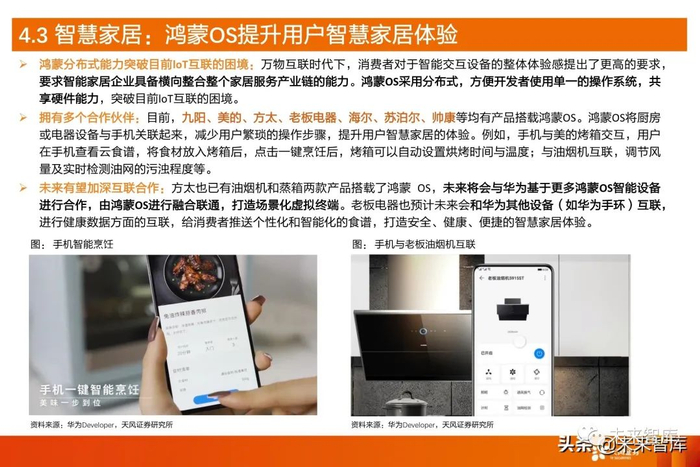 未来有望加深互联合作:方太也已有油烟机和蒸箱两款产品搭载了鸿蒙 OS,未来将会与华为基于更多鸿蒙OS智能设备 进行合作,由鸿蒙OS进行融合联通,打造场景化虚拟终端。老板电器也预计未来会和华为其他设备(如华为手环)互联, 进行健康数据方面的互联,给消费者推送个性化和智能化的食谱,打造安全、健康、便捷的智慧家居体验。
