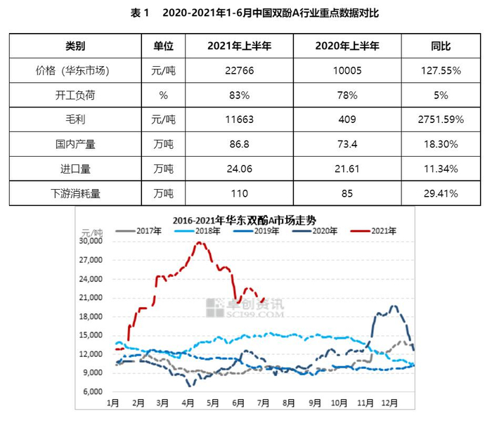 根据卓创资讯数据监测,2021年1-6月,华东地区双酚A市场均价在22766元/吨,较去年同期大幅上涨127.55%。其中最高价格在29900元/吨,最低价格在12700元/吨。从上半年产业链产品涨幅、振幅来看,双酚A均位于产业链榜首。