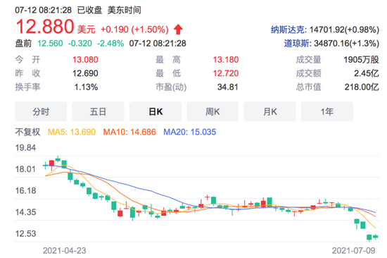 从股价上看,腾讯音乐正受反垄断压力,股价从高点的32美元,下跌到现在的12.88美元,截至发稿,盘前下跌2.41%。