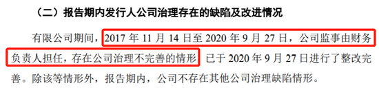 公司监事要对公司董事、高级管理人员的履职进行监督,因此公司监事不能由董事、高级管理人员担任,否则会产生自己监督自己的悖论。招股书披露,在有限公司阶段,2017 年 11 月 14 日至 2020 年 9 月 27 日,公司监事由财务负责人担任,存在公司治理不完善的情形,已于 2020 年 9 月 27 日进行了整改完善。公司于2020年12月16日才整体变更为股份公司并变更公司名称。