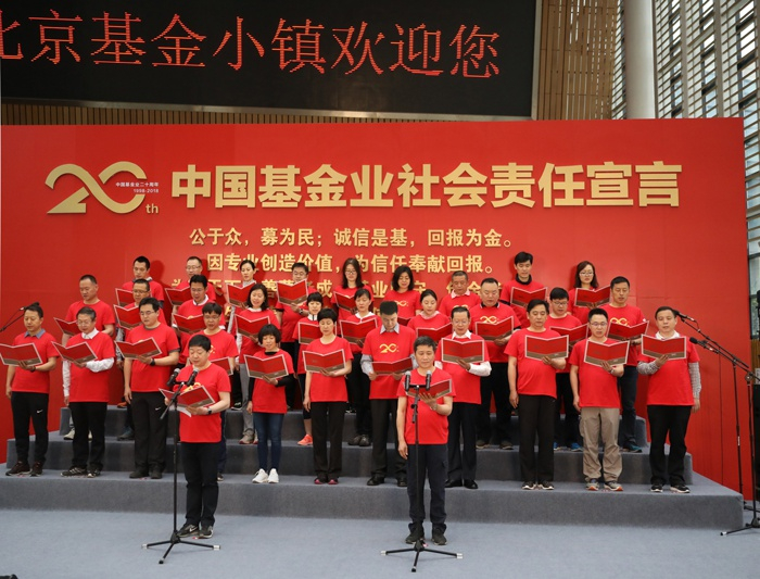 2018 年5 月5 日,在北京基金小镇,基金公司代表共同庄严宣读《中国基金业社会责任宣言》