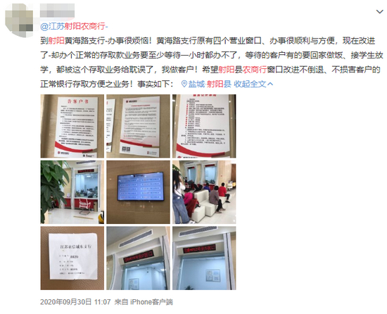 无独有偶,2020年9月份,也有一位网友在微博吐槽自己的遭遇,该网友称自己去射阳农商行一支行办理简单的存取款业务,在有四个窗口的情况下,至少等待了一个小时也没有办理成功。