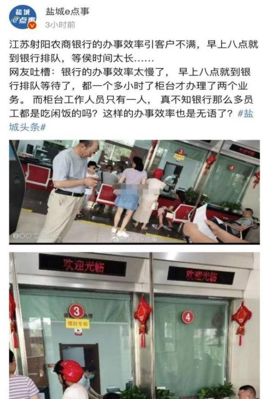 近日,微博红V“盐城e点事”发表微博,称某网友去银行办事,早上八点就去排队,一个多小时只办理了两个业务,对该银行的办事效率十分无语。