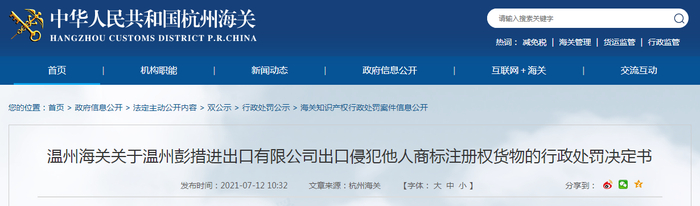 原标题:出口侵犯他人商标注册权货物 温州彭措进出口有限公司被罚款2800元