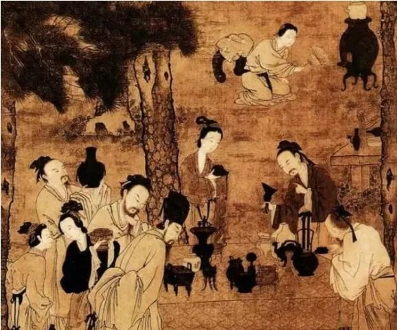 宋《博古图》局部,文人墨客把玩古董。