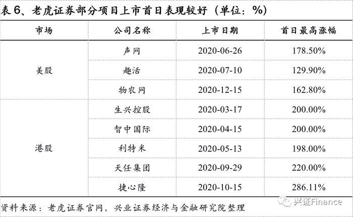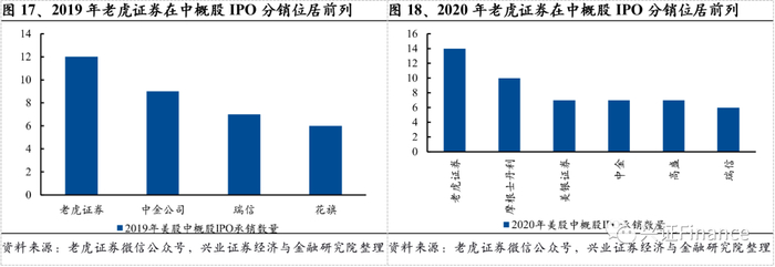 投行业务逐步成为老虎证券新增长点,同时也有效反哺其零售业务。随着老虎证券零售业务客户数量的不断增长,其发现用户有参与中概股IPO打新的需求,但以机构为主的美股市场并没有统一面向散户的公开发售渠道,因此老虎证券在2017年底从搜狗赴美上市开始试水开展IPO分销业务;2019年10月老虎证券获得美股投行牌照,IPO销售实力进一步增强。2018年在美股挂牌的哔哩哔哩、爱奇艺、拼多多、腾讯音乐等20个中概股全部由老虎提供独家打新;2020年在赴美上市的34家中概股中,老虎证券覆盖近80%,参与28个项目,其中14宗为承销项目,继2019年后再度蝉联全球范围内承销最多中概股赴美上市的投行。