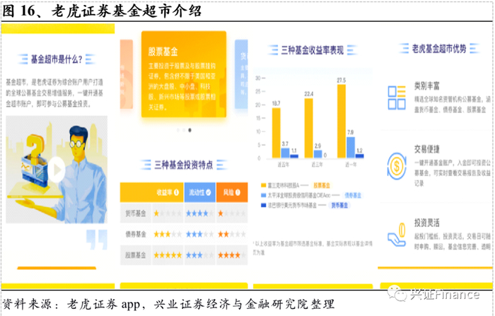 客户变现方式的变化还在于老虎证券不断探索财富管理业务,将其打造成为盘活存量资产的重要途径。老虎证券于2018年底发行全球首个同时跟踪中美两国互联网巨头的ETF产品TTTN。2019年四季度,老虎证券推出闲置现金增值服务“闲钱管家(Cash Plus)”,凭借股票账户闲置现金一键转入、零手续费、收益稳健且流动性兼备等优势,成功吸引了众多用户。2020年3月,老虎证券推出基金超市栏目,正式布局财富管理业务,基金超市功能旨在为投资者提供一站式的全球基金投资服务,首期严选近40只全球知名公募基金产品,包括富达、贝莱德、摩根大通、汇丰等顶级机构的基金产品,品类涵盖货币基金、债券基金、股票基金,以满足不同投资者的多样化资产配置需求。