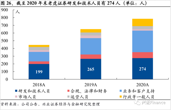 优秀的产品体验背后是老虎证券持续的研发投入作为支撑。从老虎的人员结构来看,研发和技术人员是重要组成部分,截止至2020年,共有274名研发人员,较2018年增长了75人,占员工总数的比例达到35%,显著高于传统内资券商对于产品的投入力度。