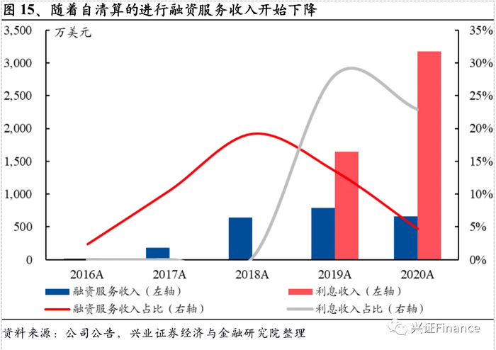 客户变现方式的变化一方面在于通过收购Marsco实现自清算,将融资服务费转化为回报率更高的融资融券业务收入。2015年8月老虎证券在美股开展经纪业务的同时随即开展融资融券业务,次年5月在港股市场提供融资融券服务。早期由于清算牌照的缺失,老虎证券对老虎环球账户提供的融资融券业务依赖于盈透证券展开,老虎证券仅收取融资服务费,2017-2019年结算代理提供的年化融资服务费率分别为0.39%、0.87%和0.91%,显著低于传统融资融券业务的净息差水平。