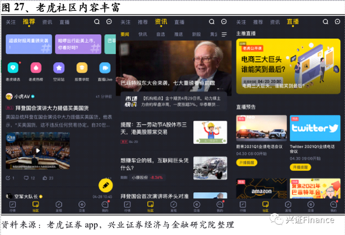 相较于传统券商,老虎证券连接客户和上市公司的社区运营方式为客户自然增长提供了新的路径:一方面,在老虎社区中,除了提供交易行情和新闻资讯信息之外,老虎学院对港股和美股交易提供详细的教程,能够让投资者快速入门;另一方面,与股吧和雪球类似,老虎社区开放给投资者进行发帖讨论,形成有效的互动,但其涉及到的投资标的主要为港美股;同时,老虎证券还推出“上市公司官方企业号”服务,上市公司可在app交易软件的老虎证券社区开通企业号与投资者近距离交流,入驻企业可通过企业号进行包括业绩发布会、产品发布会等在内的线上直播,进一步促进投资者对公司的了解。企业号支持视频、音频等多种传播载体的直播和回放,同时企业可按需灵活选择公开直播或者小范围邀请特定的人员进行直播,且直播信息在多个页面展示,增加对目标群体的曝光量。目前百度、网易、美团、斗鱼、小米、新东方等近百家上市公司入驻老虎证券社区。