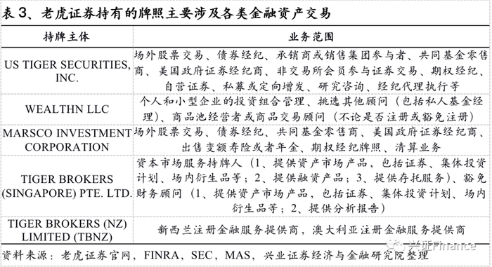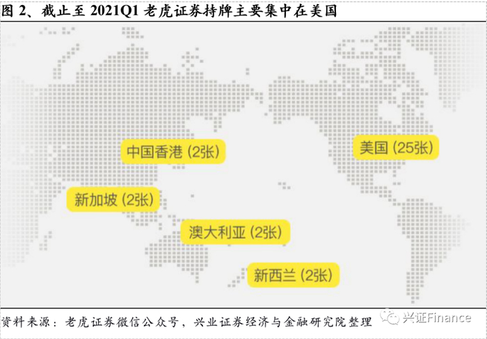 截止至2021Q1,老虎证券通过外延式并购在美国、新西兰等地获33张金融牌照。在美国,目前老虎证券持有经纪牌照、投行牌照、注册投资顾问牌照、自清算牌照以及期货牌照等金融牌照,成功构建了从私募融资、发行承销、证券交易、财富管理到清算的完整业务闭环,晋身为全牌照券商;除了美国市场之外,老虎证券还在新西兰、澳大利亚、香港和新加坡等区域获得了相应的金融服务牌照,开展证券业务。