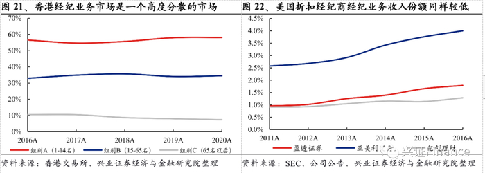 相对分散的证券经纪业务竞争格局赋予以老虎证券为代表的互联网券商突围的空间。从赛道的选择来看,老虎证券以零售经纪业务为主要切入点;纵观港股和美股市场,可以看到证券经纪业务是一个相对分散的竞争格局,且从过去5年的份额变化来看其竞争格局相对比较稳定,以港股市场为例,香港交易所按照市占率的排名分为A(第1-14名)B(15-65名)和C(65名以后)三组,过去五年ABC三类市场份额基本分别稳定在55-60%、30-35%和5-10%,美国以盈透证券、亚美利交易等为代表的折扣经纪商的经纪业务收入市占率同样不高。这意味着,老虎证券只需要挤占尾部公司的市场份额就可以比较快速的做大资产规模。