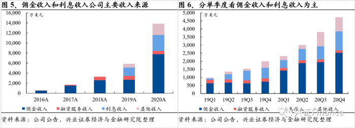 分结构来看,老虎证券的收入结构主要包括四个部分:1)交易佣金收入,其中按照账户类型可以分为两个部分,老虎综合账户(Consolidated accounts)和老虎环球账户(Fully disclosed accounts.),前者主要是老虎证券直接为客户提供证券经纪服务并以此确认收入的全部佣金收入,后者主要是老虎证券扮演介绍商的角色,客户的交易和结算均由盈透证券完成。2)融资服务费收入,主要是盈透证券向客户提供的保证金融资、融资融券交易产生的费用,这里主要针对老虎环球账户。3)利息收入,主要是向老虎综合账户提供的保证金融资和融资融券交易产生的利息。4)其他收入,主要包括IPO分销收入、员工持股解决方案(ESOP)收入等。2020年,老虎证券分别实现交易佣金收入、融资服务费、利息收入和其他收入7763、658、3175和2254万美元,同比分别变动+190.8%、-17.0%、+92.4%、+199.2%,过去三年来看,除了融资服务费,其余业务均保持快速增长的节奏。