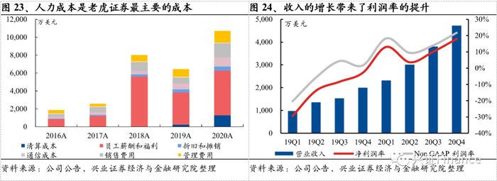 另一方面,以互联网平台为主的经纪业务模式随着客户资产的增长有望实现规模效应。不同于线下获客模式依赖于大量的线下经纪人,老虎证券的经营成本主要来自于前端获客的广告成本和中后台运营成本,运营成本并不随着业务增长而保持线性增长,因此一旦度过覆盖固定成本的规模拐点,老虎证券的盈利能力区间将呈现快速上行态势。随着客户数和客户资产的扩张,2020年老虎证券已经度过盈亏平衡的拐点,这意味着随着公司客户规模的持续扩张,其利润增速或将获得高于收入和客户增长的表现。