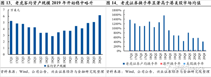 客均资产的增长主要依赖于两个方面:1)客户将更多的资产转入老虎证券的交易账户;2)存量的客户资产随着市场或者投资标的的增长出现自然增值,过去3年港美股打新的良好市场回报率为老虎证券客户资产的增长提供了一定契机,也成为推动老虎证券客户数量增长的重要驱动力。一方面,美股市场依然是优质中概股进行上市融资的首选市场。2018-2020年期间,从拼多多、哔哩哔哩、ZOOM到金山云、贝壳、理想汽车、小鹏汽车,优质中概美股的打新机会几乎全被老虎证券覆盖,为投资者创造了不错的赚钱效应。另一方面,阿里巴巴、京东、网易等优质中概股开始选择在港股二次上市,由于当前其未被纳入沪港通,内地投资者缺少合适的投资渠道,通过老虎证券可以提供20倍港股融资、支持暗盘交易的新股交易业务。从2017年以来的时间序列数据来看,老虎证券户均资产的增长没有十分明显,预计和股票市场的波动存在较大的相关性。