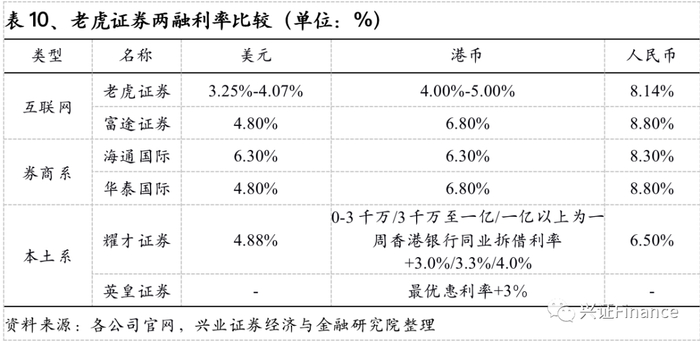 融资融券利率方面,老虎证券使用基于以下等级的混合利率,随着融资规模的增长其年化利息率则进入下降趋势,其中美元的融资利率区间在3.25-4.07%,港币的融资利率在4.0%-5.0%,新币、澳元、欧元、英镑等融资利率基本都在3-4%区间波动。相较于其他内资券商的香港子公司,老虎证券的融资利率同样具备较强的费率优势,具备吸引力的融资利率使得老虎证券在吸引增量客户的过程中具备比较优势。