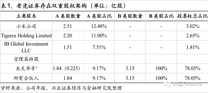 老虎证券采用双重股权架构(AB股)的设置。A类普通股和B类普通股的持有人享有相同的权利,但存在表决权和转换权差异;每股A类普通股有权投票,在任何情况下均不可转换为B类普通股,每股B类普通股有权获得20票,在特定情况下将自动转换为一股A类普通股。截止至2020年末,公司创始人巫天华持有0.225亿股A类股,持有3.15亿股B类股,投票权中占比达到78.05%,所有合伙人合计持有1.84亿股A类股,持有3.15亿股B类股,投票权中占比达到78.05%。此外,股东名单中还有小米、盈透证券等重要战略合作伙伴。