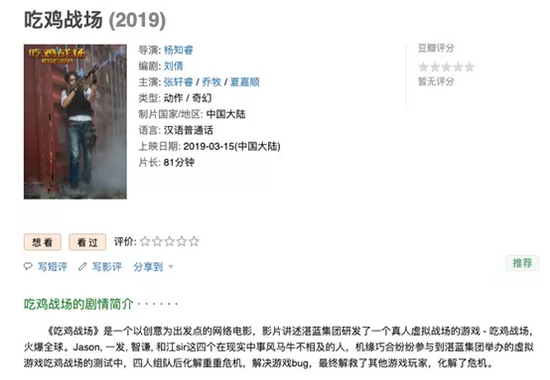 IPO日报搜索发现,《吃鸡战场》是一部网络电影,由张轩睿、乔牧、夏嘉顺等演员出演,已于2019年上映,电影本身及演员的知名度均不算高,也暂无豆瓣评分。